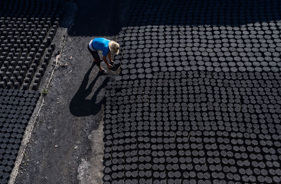 Workers in the honeycomb cob workshop frequently takes turn to change up and down the cobs under the sunlight. Making honeycomb is one of the traditional jobs in developing countries like Vietnam
