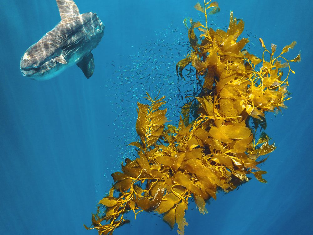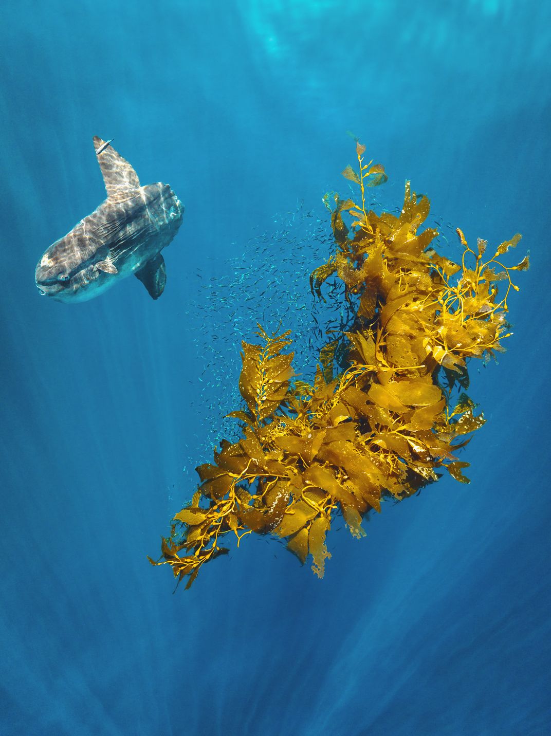 Mola Mola // Islas Coronado // Baja An aerial photo of a Mola Mola (Ocean Sunfish) next to some floating kelp. Their scientific name Mola was given in the 1700s by Swedish naturalist Carl Linnaeus. He likened them to a large, grey millstone - ‘mola’ in Latin.