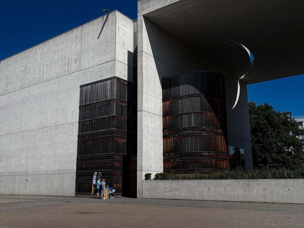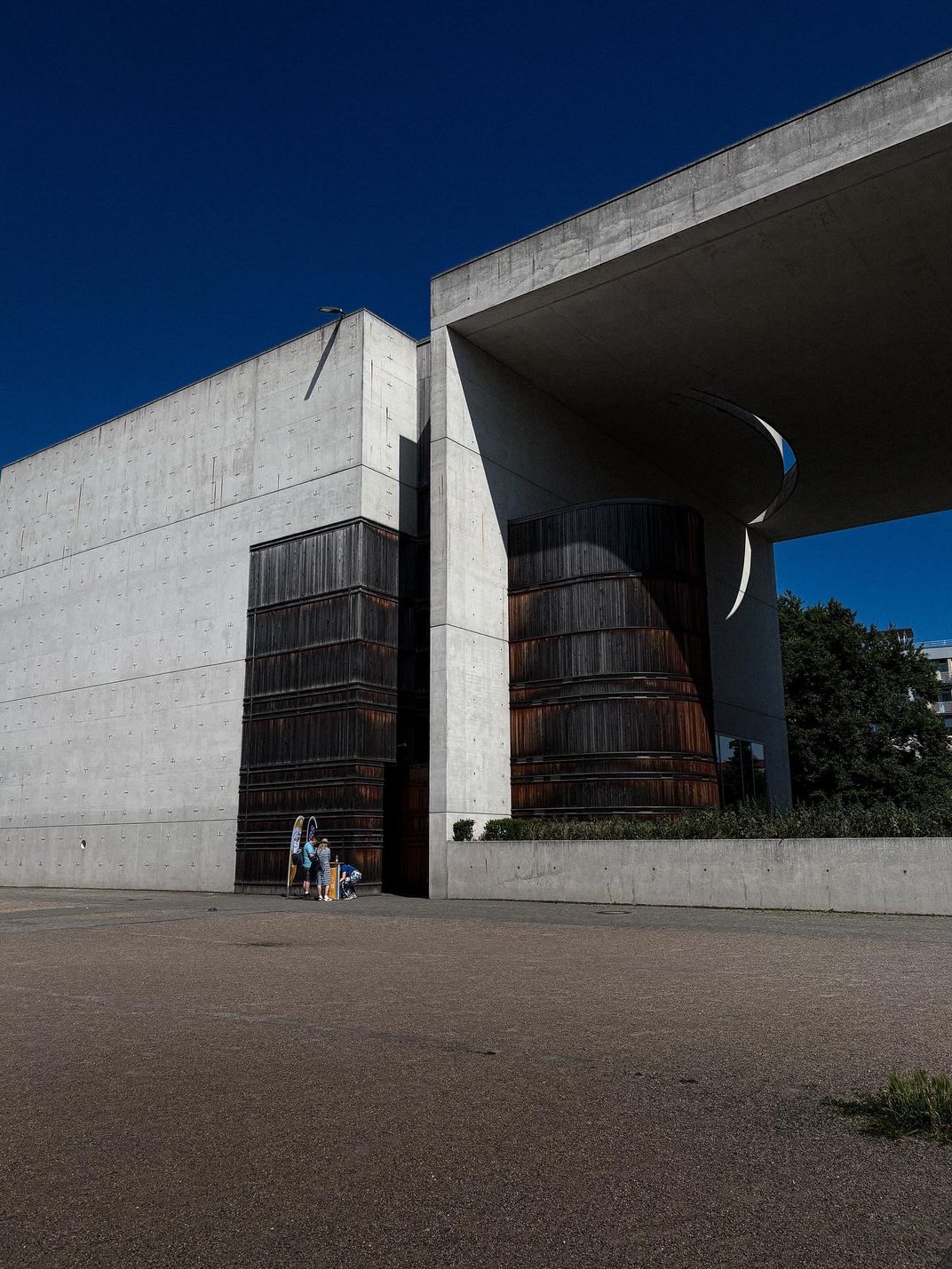 A modern concrete structure catches the sharp midday light, revealing clean lines, heavy shadows, and a deep blue sky that emphasizes the building’s bold geometry.