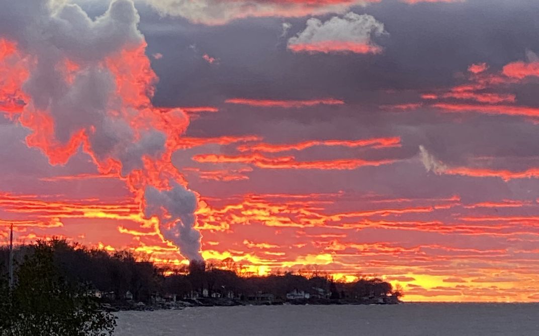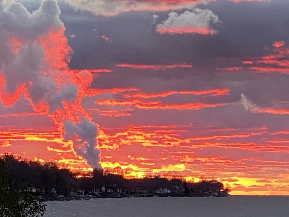 Who knew that a nuclear power plant could be so beautiful! The sun setting behind the Perry (Ohio) Nuclear Power Plant edged its water vapor cloud with vivid golds and reds, and lit up the sky! Gorgeous...yet scary and ominous.