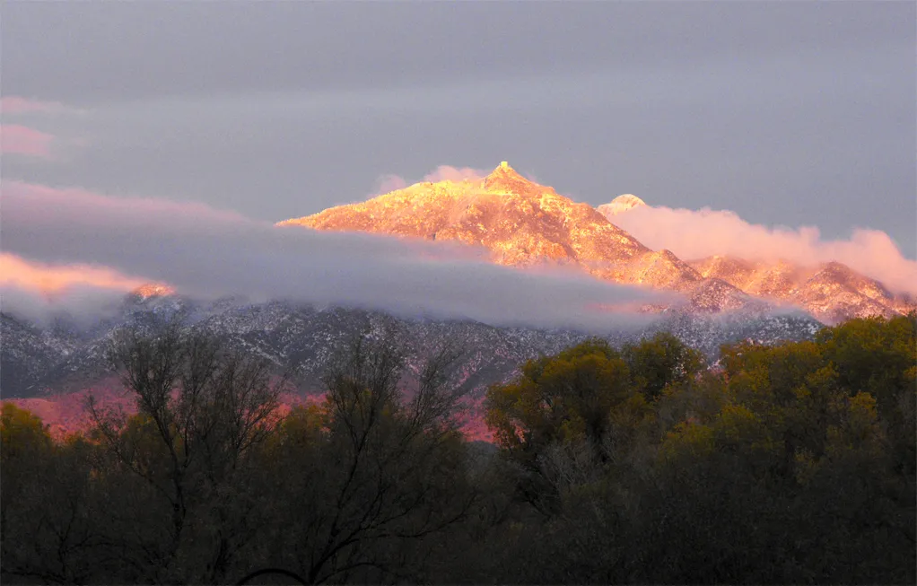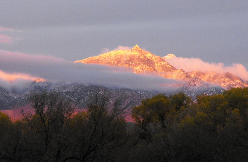 Sun setting on a snowy desert mountain (Whipple Observatory)
