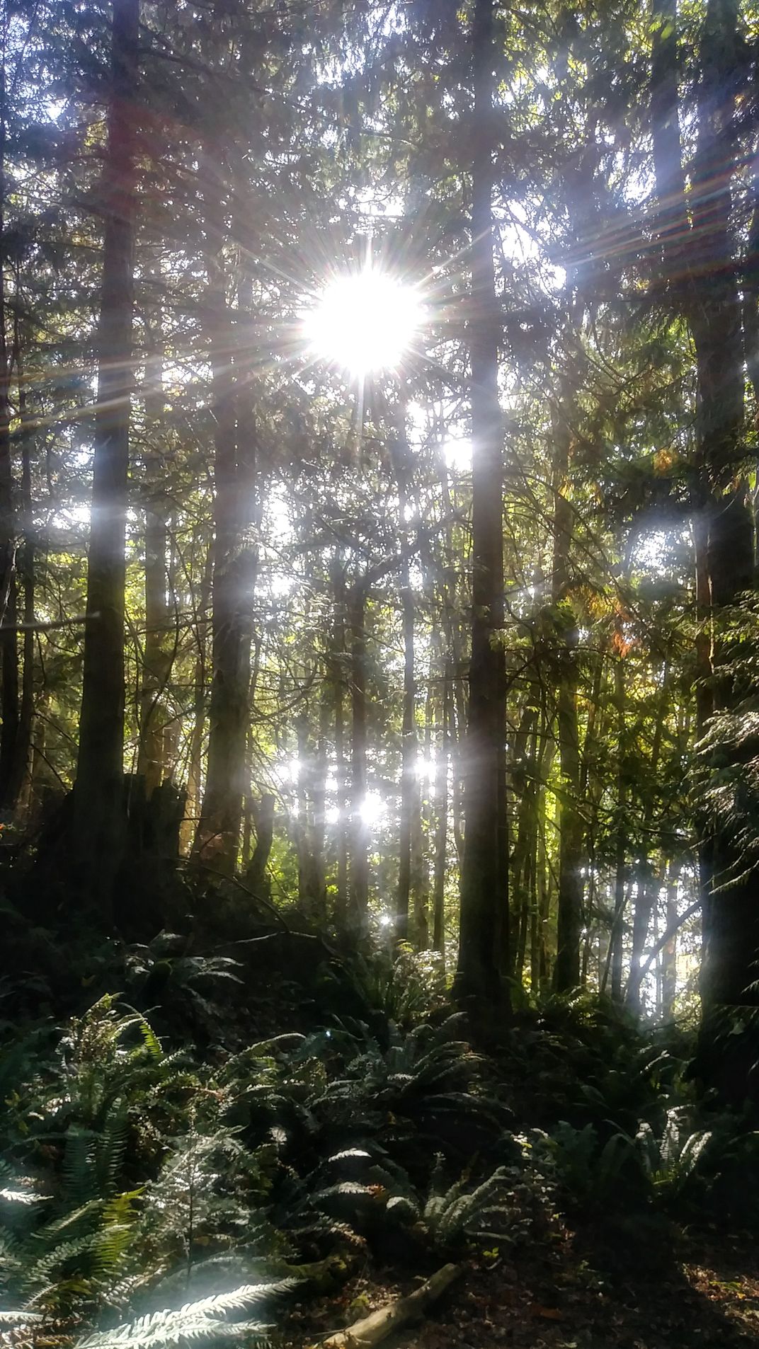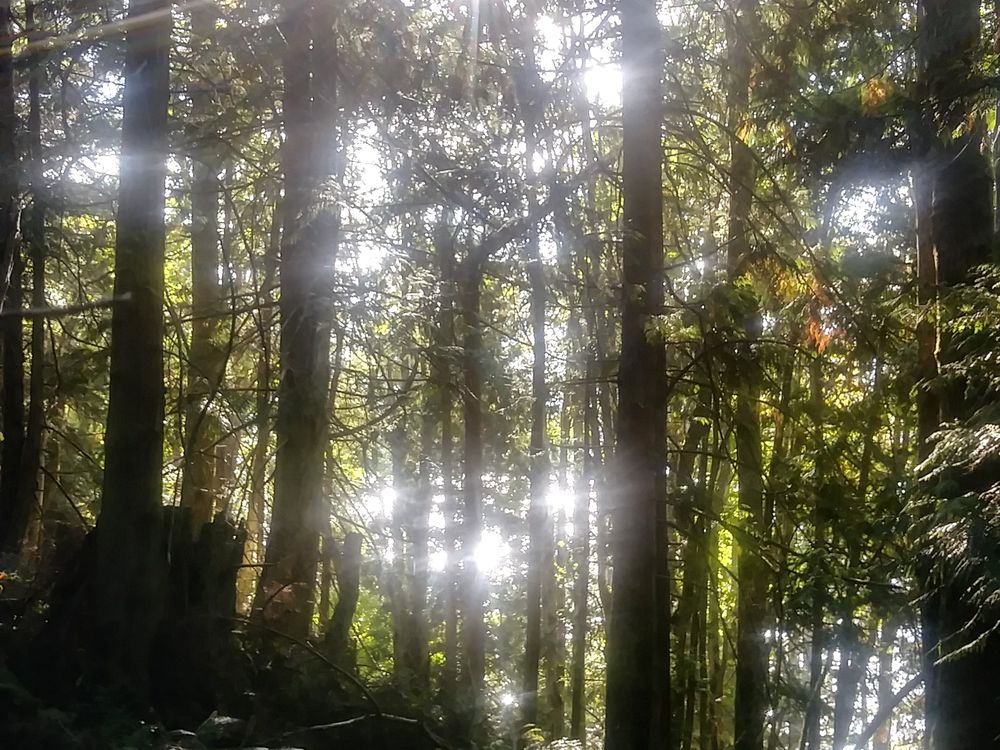 While walking through the woods, the sun and water below had the same color and shine, it was hard to distinguish to two.