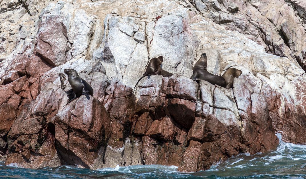 Four sea lions sunbathing in Ballestas Islands. Located off the coast of Paracas in Peru, the Ballestas Islands are home to a great variety of wildlife. These islands are part of the Paracas Wildlife Reserve, a safe place for animals, some of them in danger of becoming extinct.