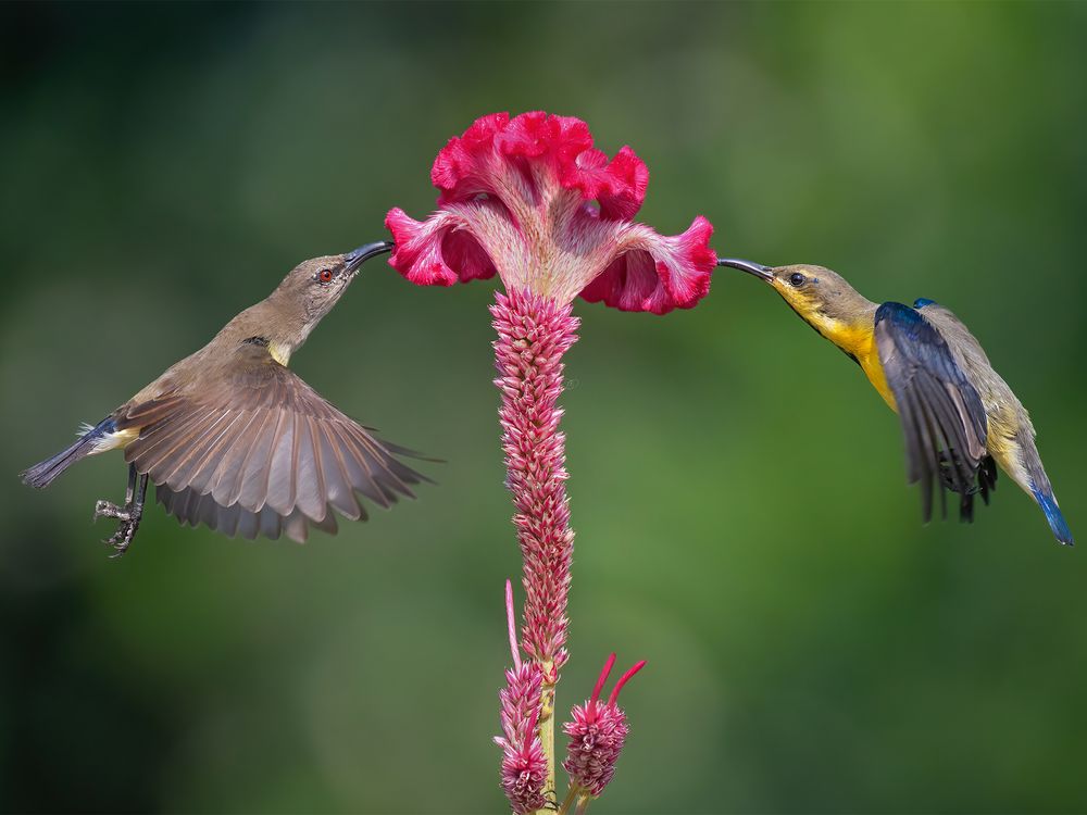 Two sunbirds, a juvenile male and a female sunbird feeding on nectar from a cockscomb flower, also known as plumed cockscomb flower. The sunbirds have an unique characteristic of hovering around the flower with their wings flapping, and they suck nectar from the flower simultaneously.