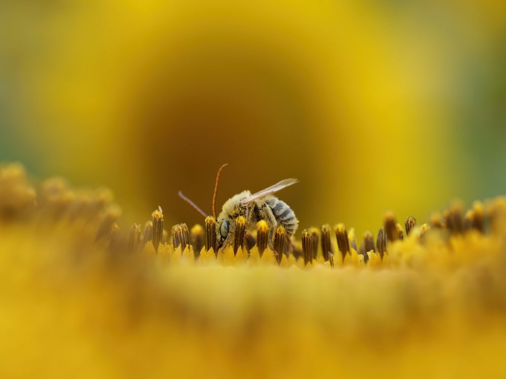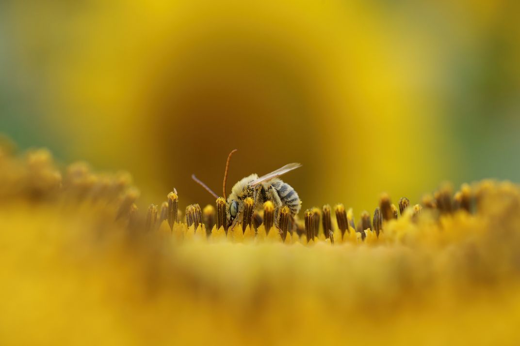 Bees are pollinators of many species of plants, including sunflowers. In the late summer, these insects can often be found covered in yellow pollen as they buzz around the fields.