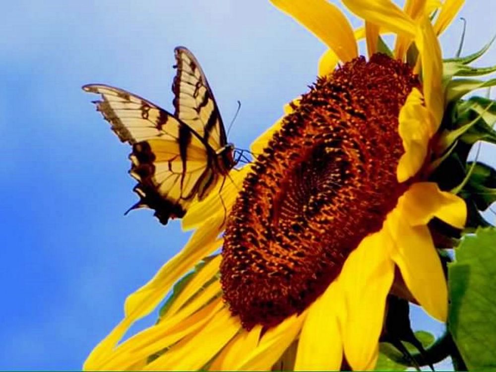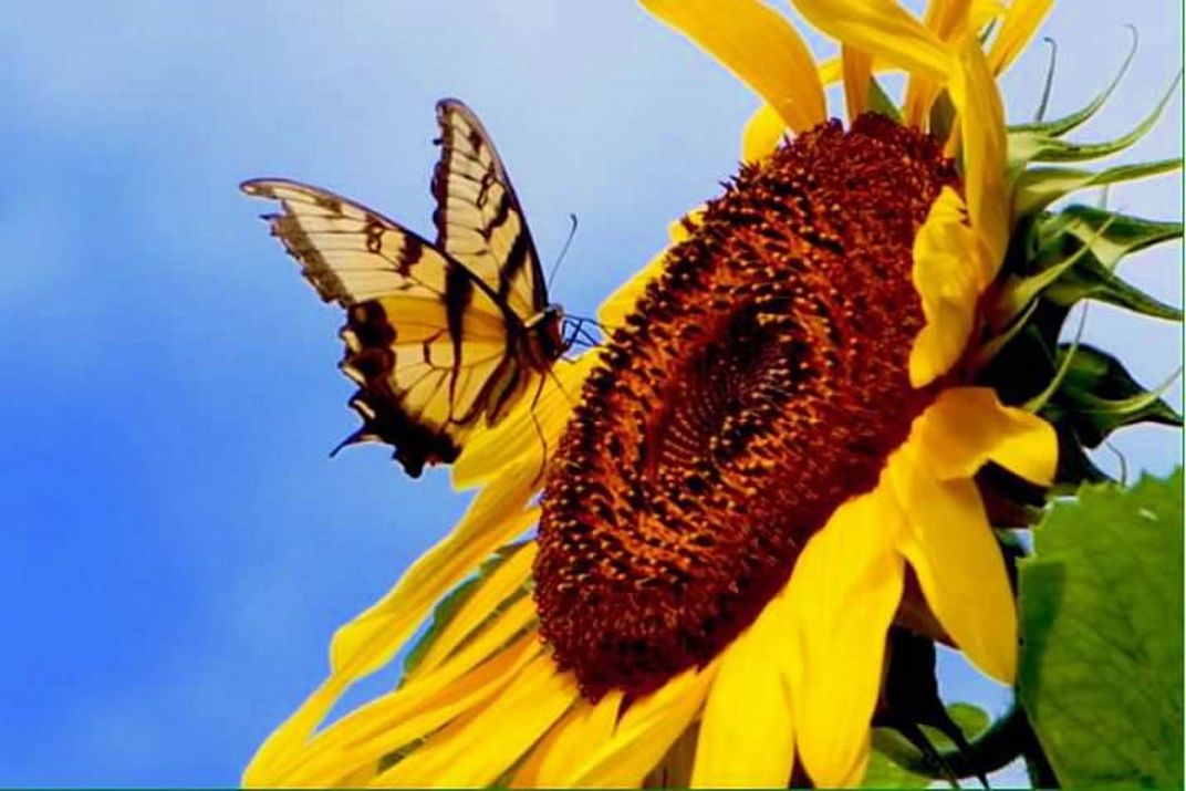 Sunflower with a butterfly. This flower was nestled in my small veggie garden.