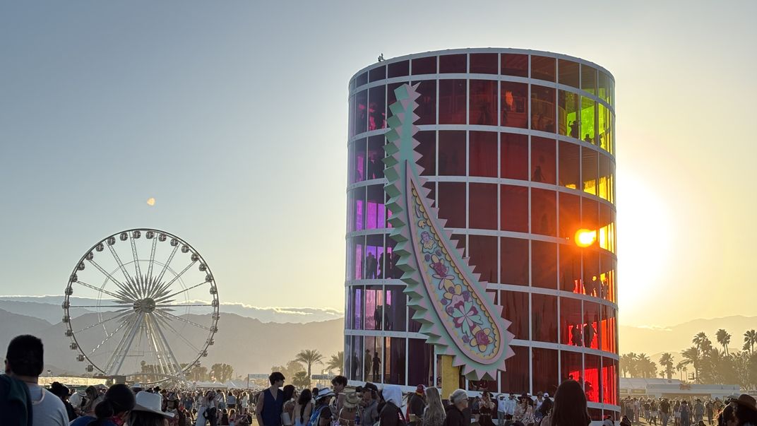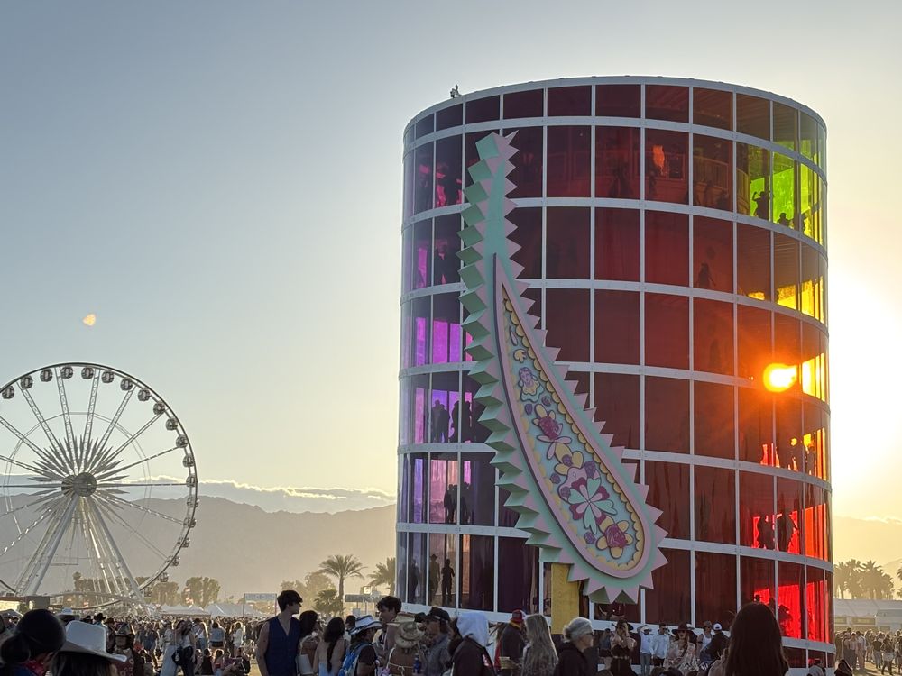 The sun shines through the art installation window panel just above the mountains. in the distance you can see the ferris wheel. A crowd is gathered for a music festival in the desert