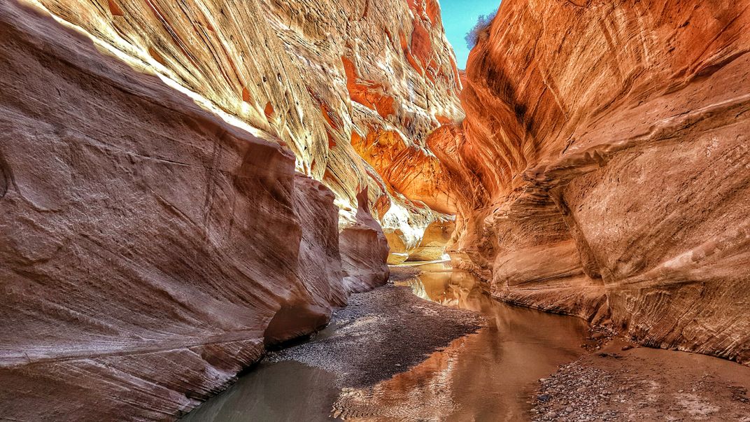 Deep into a Utah slot canyon that has recently seen rain, the sun manages to find a section shallow enough to reach the bottom.