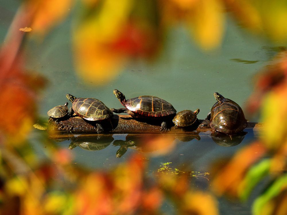 A group of painted turtles lined up and sunning on a submerged tree branch viewed through fall foliage at the edge of a central Maryland lake.