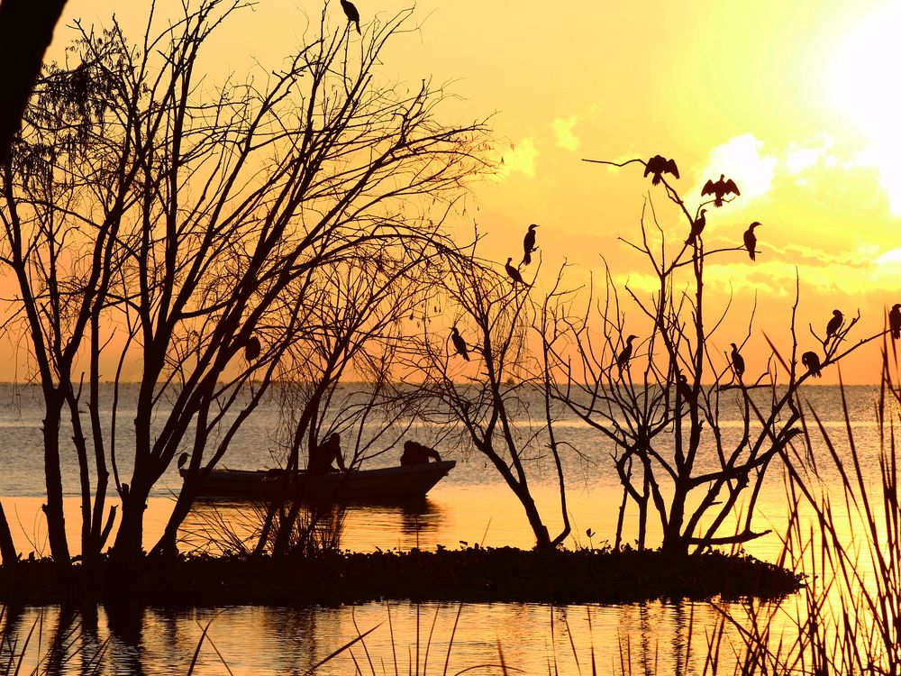 FISHERMAN AT SUNRISE IN CHAPALA LAKE, BETWEEN TREES