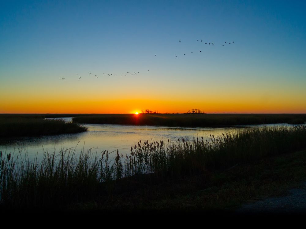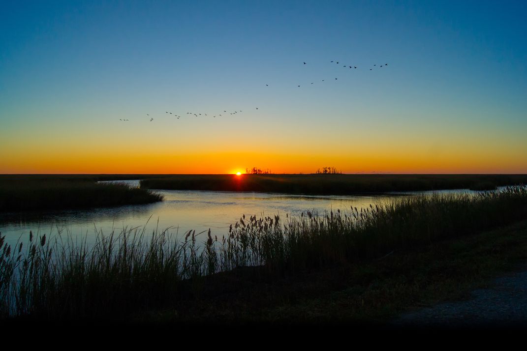 Sun rising over the salt marshes at Bombay Hook National Wildlife Refuge on a chilly October morning as a flight of geese passes overhead.