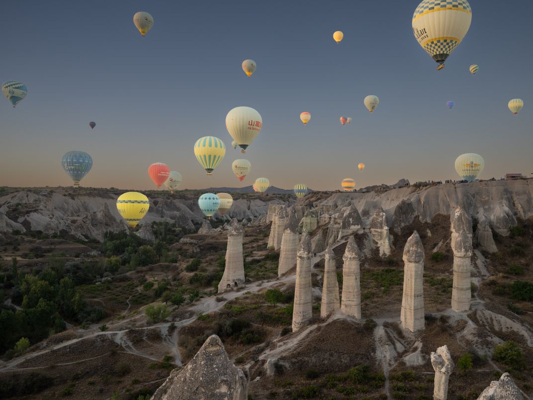 53 Balloons lifted off together at Sunrise in Cappadocia, Turkey. This area is known for the out-of-the-world scenery, including the famous fairy chimneys shown in this picture. We spent a month in Greece and Turkey two months ago, and this was one of the high points of the trip.