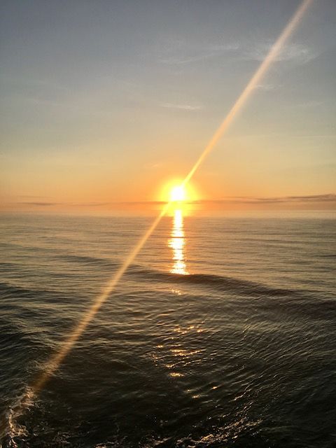 This is a picture of the sunrise at Kure Beach, NC on 06/24/2019. The sun is just over the horizon and is reflecting brilliantly across the ocean with two rays of light coming from it going in opposite directions one to just off the top right corner and the other to the bottom left corner. It has a halo of yellow light with orange light raditating off of it melding into a grayish light-blue sky with wisps of clouds.