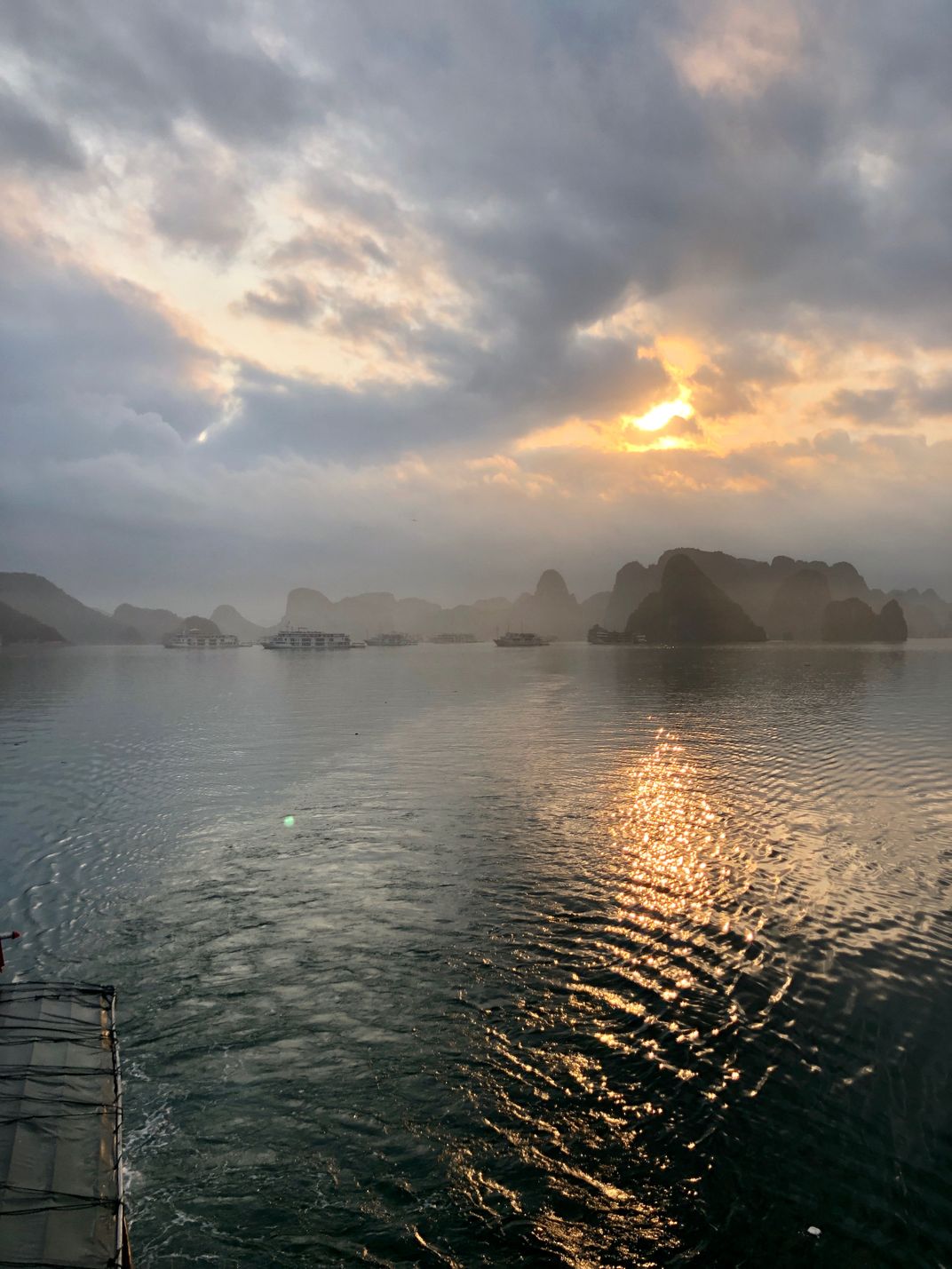 While cruising on our sailboat amid the misty islands and grottoes of Halong Bay in Vietnam, we were treated to this glorious sunrise, which cast a lovely golden glow to the clouds and water. No photo filters were necessary to capture the colors of this scene.