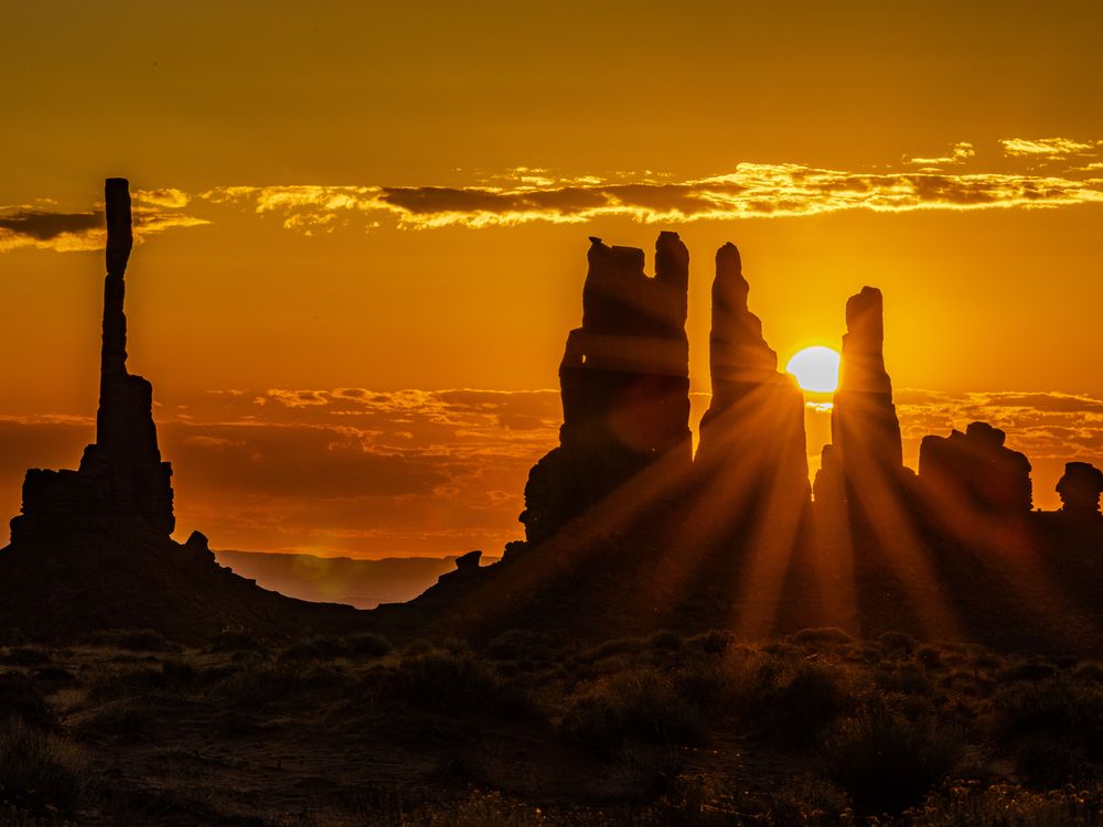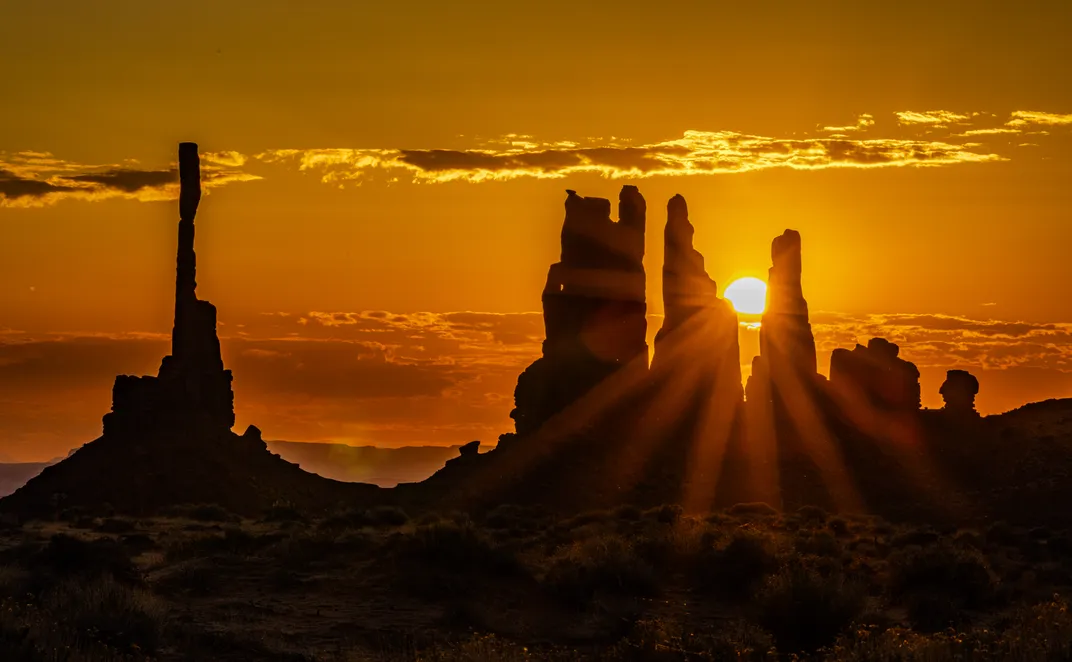 Morning in America with the sun peaking through the totem poles in Monument Valley against the orange dusted sky. Growing up in the 1960’s and 70’s, the western movies and TV shows is how I identified as an American. The old West and forging a trail across the wide open spaces. Monument Valley is Americana on display.