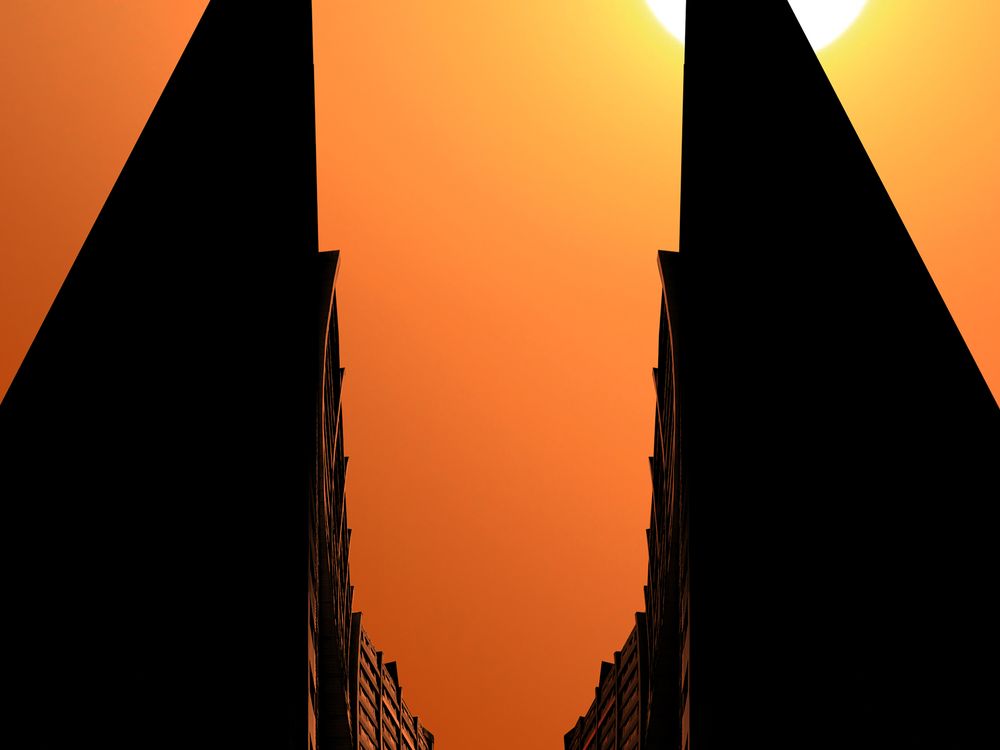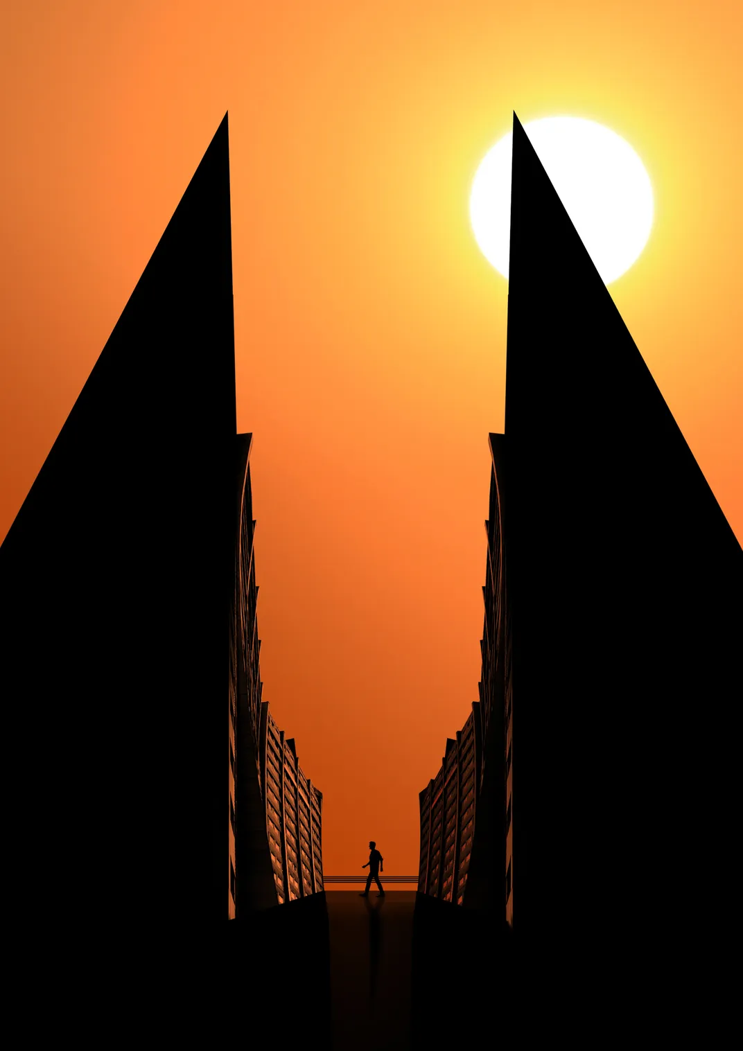 In my opinion, the before and after photo shows the dramatic scene of a passerby passing by the towers at sunset.