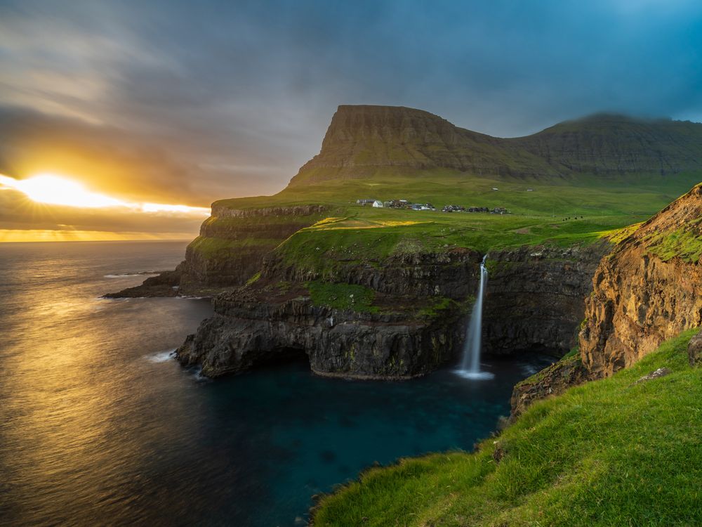 Sunset light sweeps across the cliffs of Gásadalur in the Faroe Islands, illuminating the village and its iconic waterfall as it drops into the Atlantic. A moment where dramatic weather, rugged nature and serenity meet.