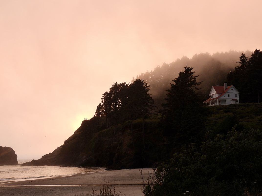 This photograph shows the Oregon coast at sunset. Featured in the photograph is Heceta Beach and the Lighthouse Keepers Cottage at sunset as the fog rolls in.