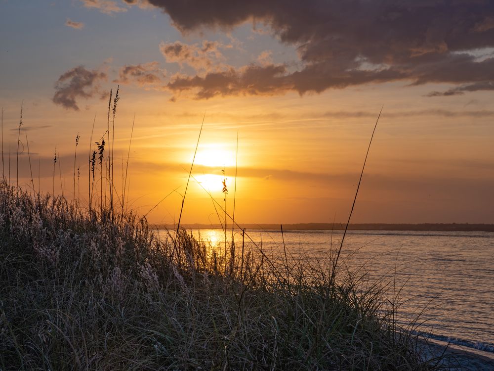 The sun sets over the water at Serenity Point on Topsail Island in North Carolina.