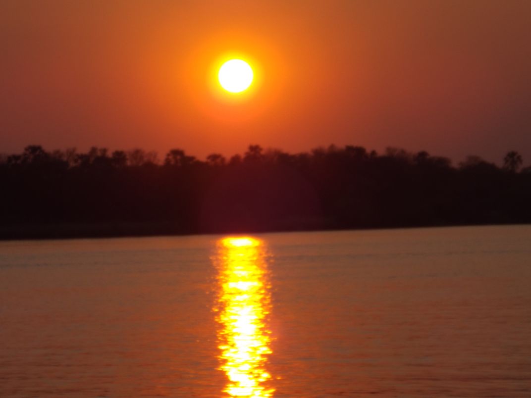 The photo depicts a sunset cruise ride image taken in the Zambezi river between Zimbabwe and Zambia.