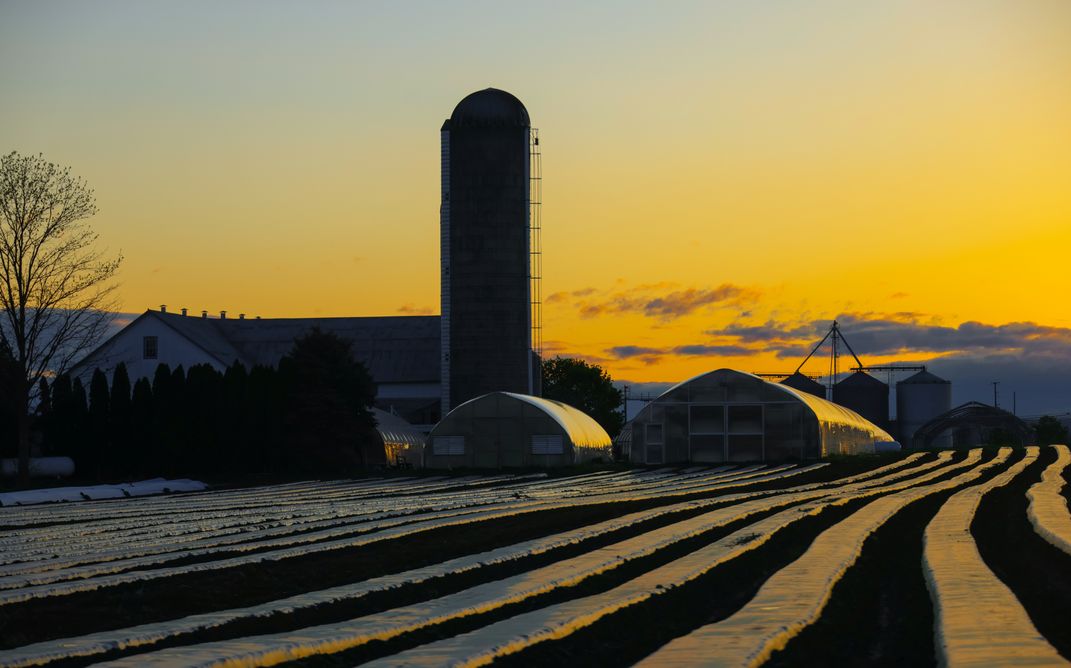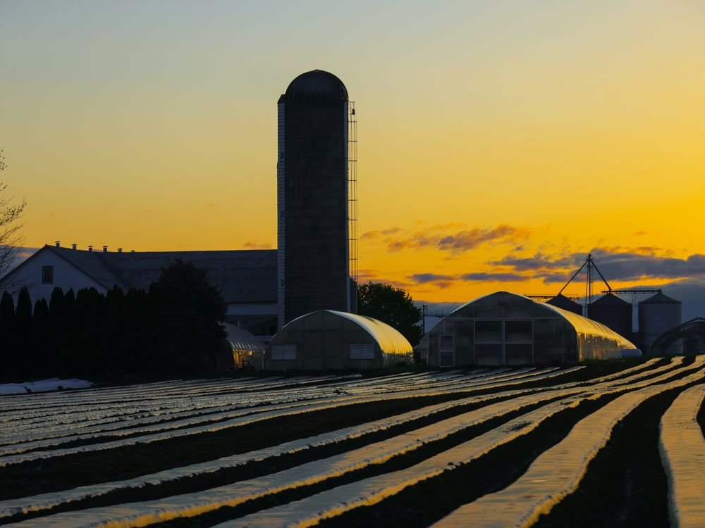 The white vinyl sheets on the farm are bathed in the sunlight, creating a striking atmosphere.