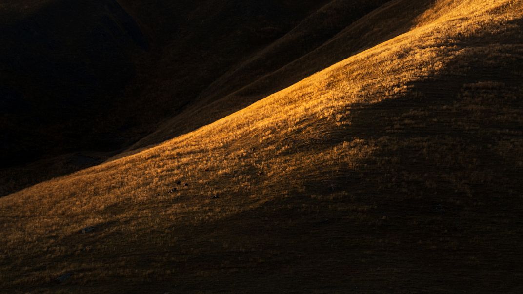 Deep in the Caucasus Mountains, there's a remote village famous for its stone defensive towers. The small village is situated deep in a mountain valley, which eventually deadends in soaring mountain peaks and glaciers. It's a difficult living with harsh winters and little livestock. But, in autumn the entire area goes gold. Here you see resilient cattle braving the steep hillsides to graze almost like mountain goats.