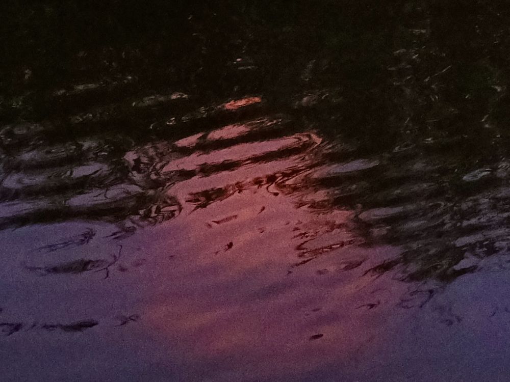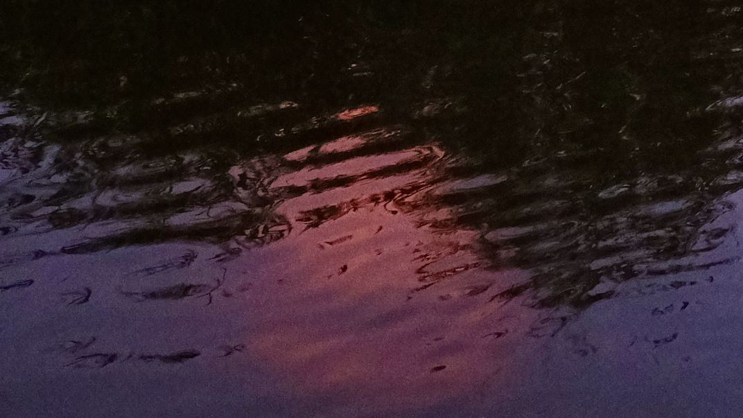 Reflection of sunset and reeds on the water.