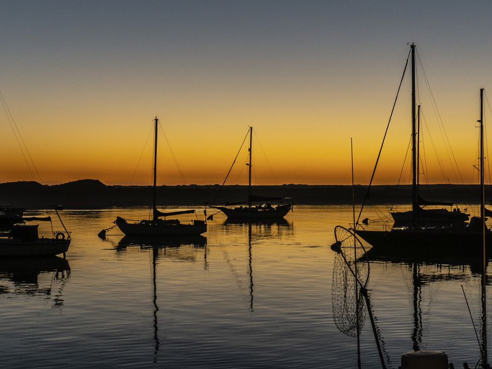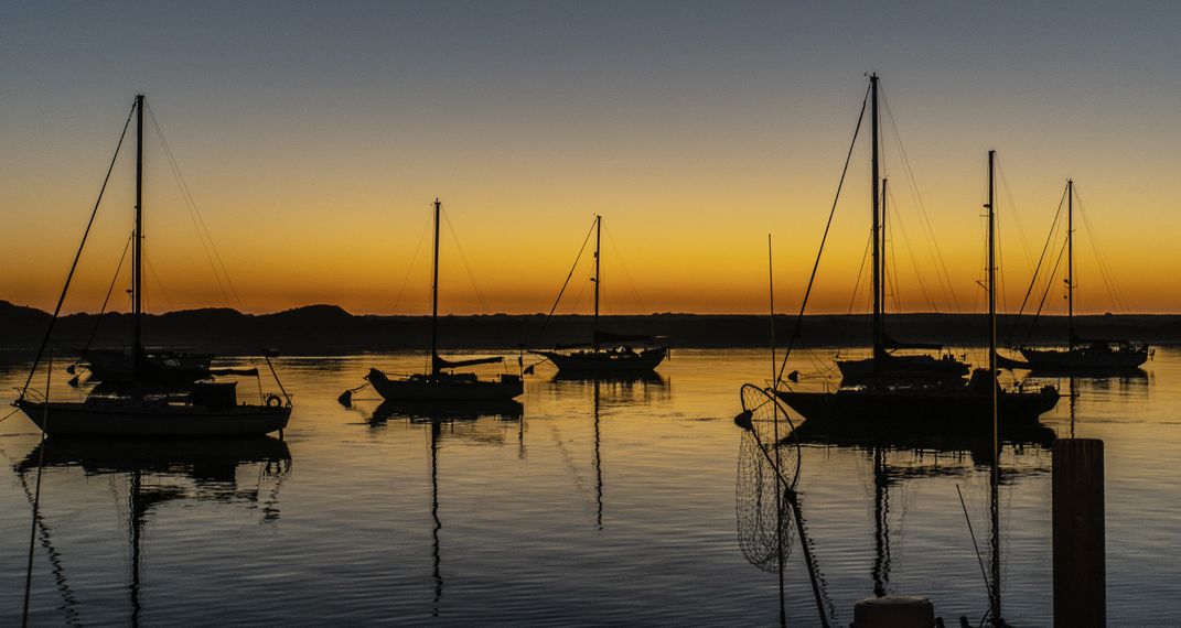 This photo shows silhouetted sailboats moored in Morro Bay, California.