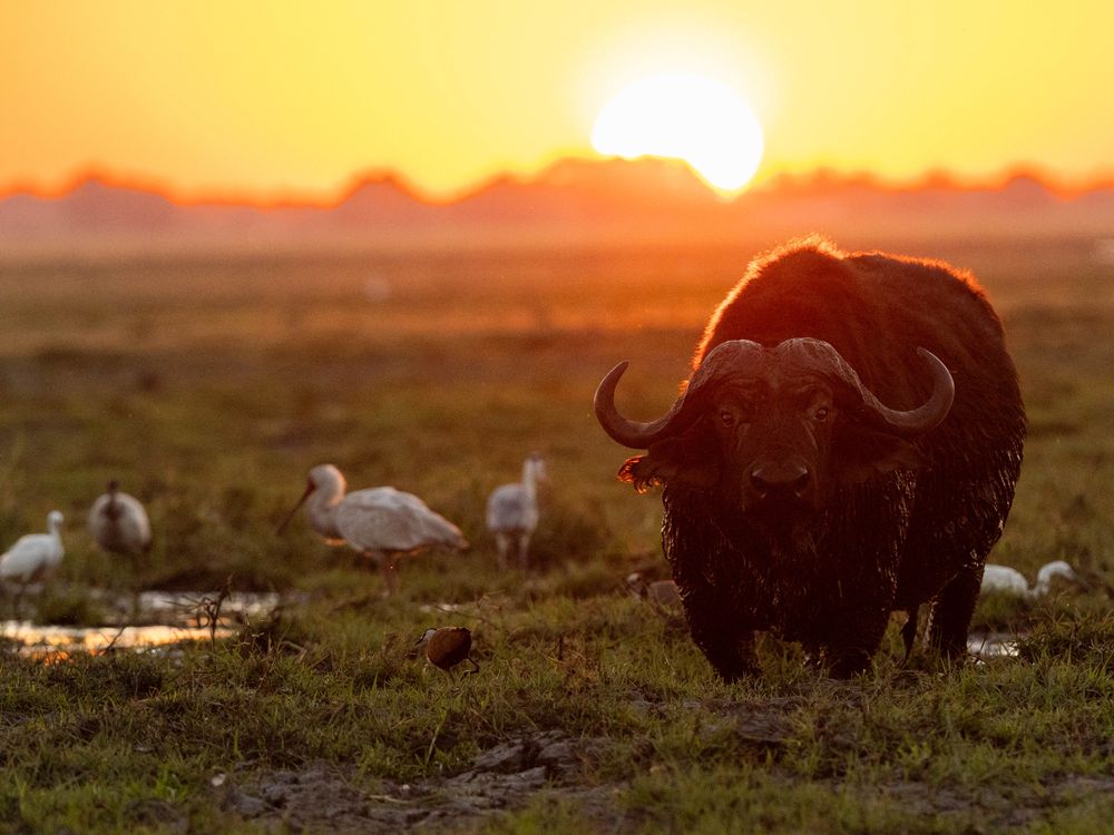 As the sun was setting on the Chobe River, we were fortunate to find a lone buffalo with the sun setting directly behind him creating a beautiful back lit image. The birds fishing nearby added to the peaceful scene as he stared intently at me.