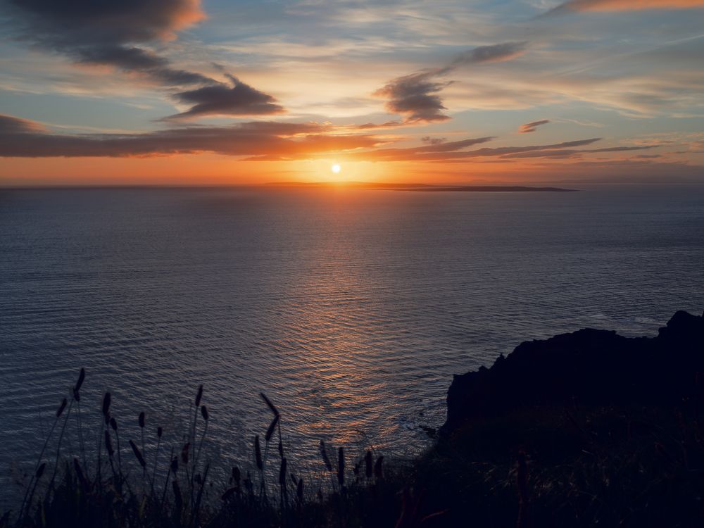 A view of the sun setting behind the Arran Islands, as taken from the Cliffs of Moher.
