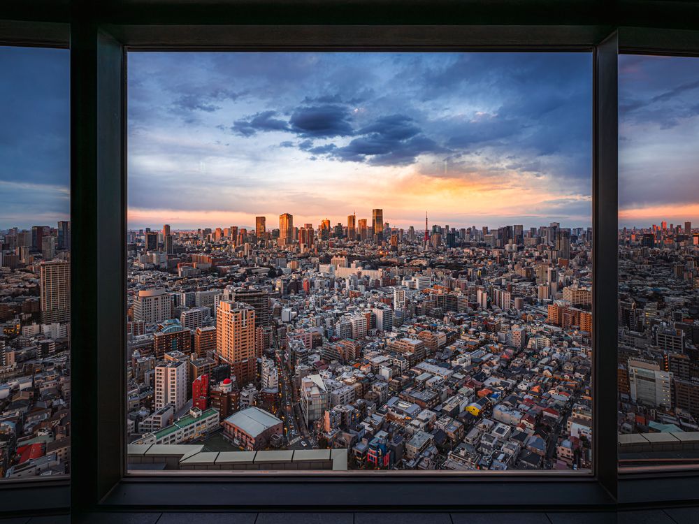 From the top floor of Ebisu Garden Place, the city of Tokyo stretches to the horizon as winter light slips into dusk. Tokyo Tower and the central business district glow beneath a sky still holding the last colors of the setting sun.