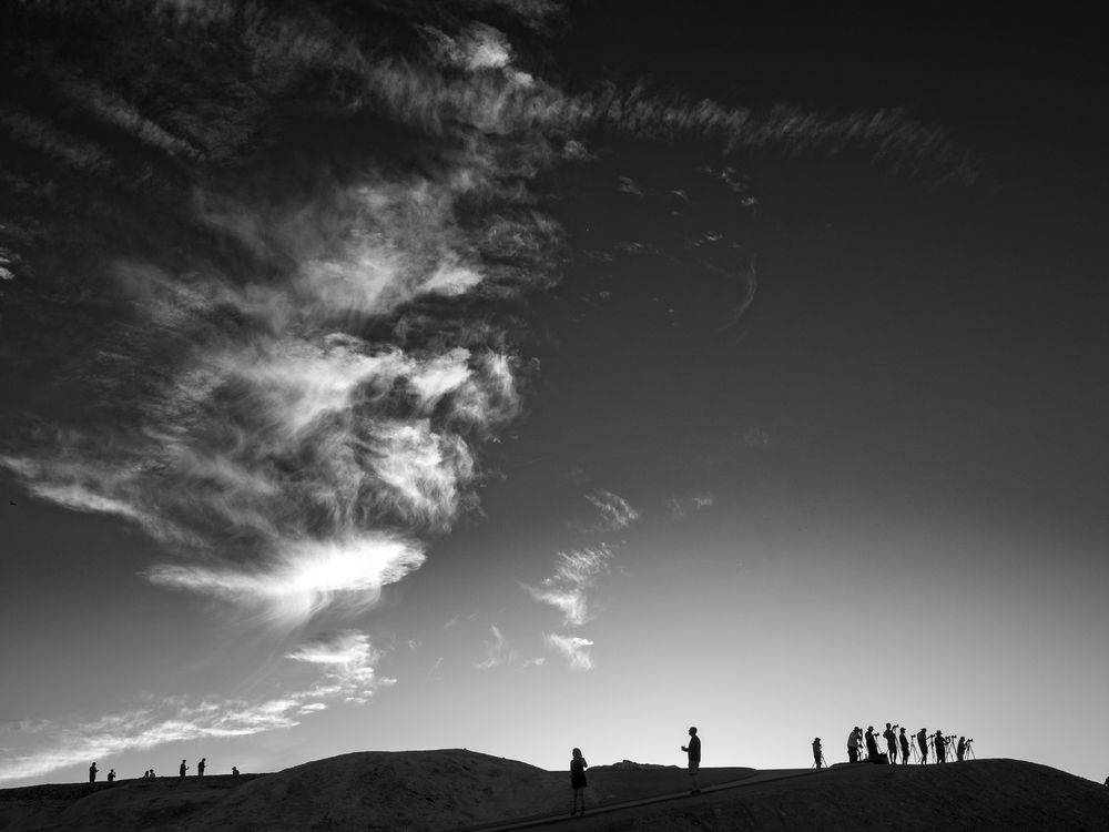 The silhouettes of a group of photographers at Zabriskie Point in Death Valley taking pictures at sunset, with a trail of clouds lit up by the setting sun behind them.