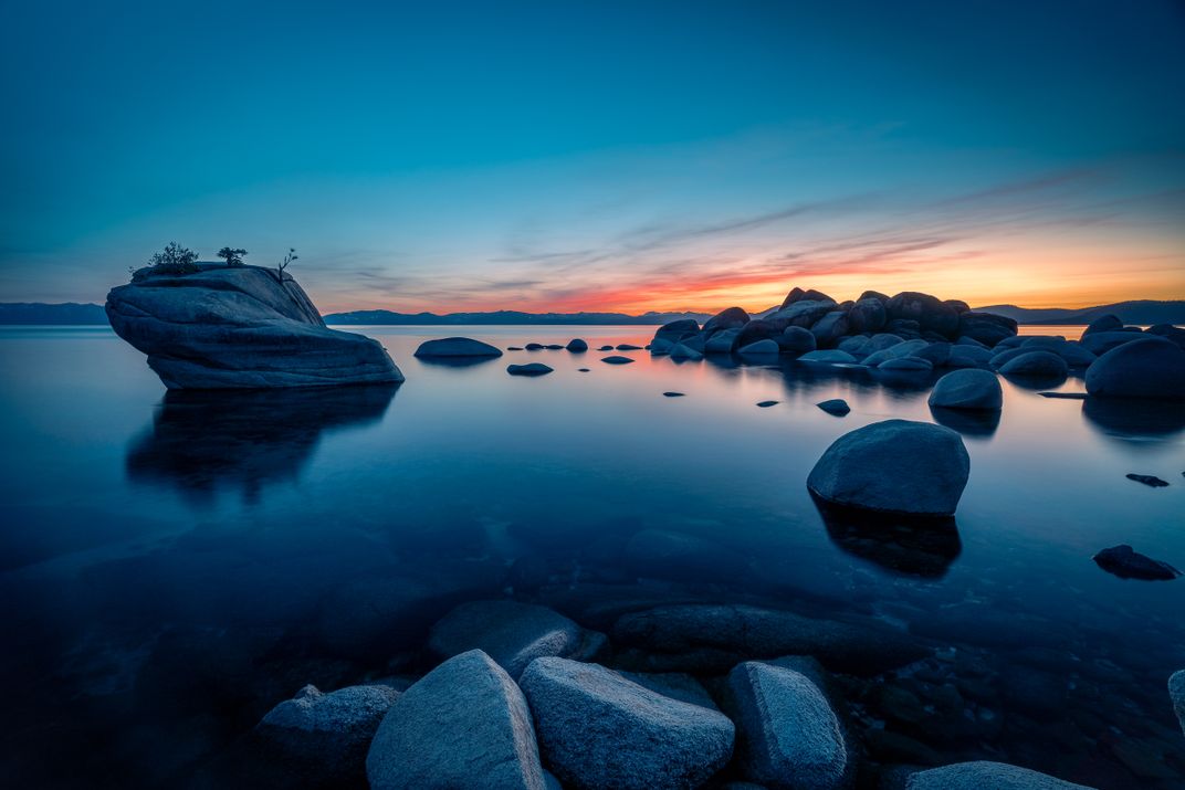 Rocks bursting out of Lake Tahoe after sunset, with a still reflection.