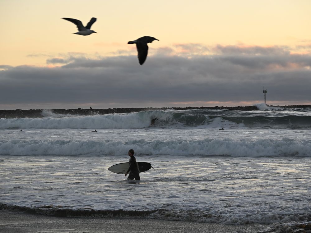 A beautiful evening right at golden hour with a surfer wading through the surf while seagulls fly overhead