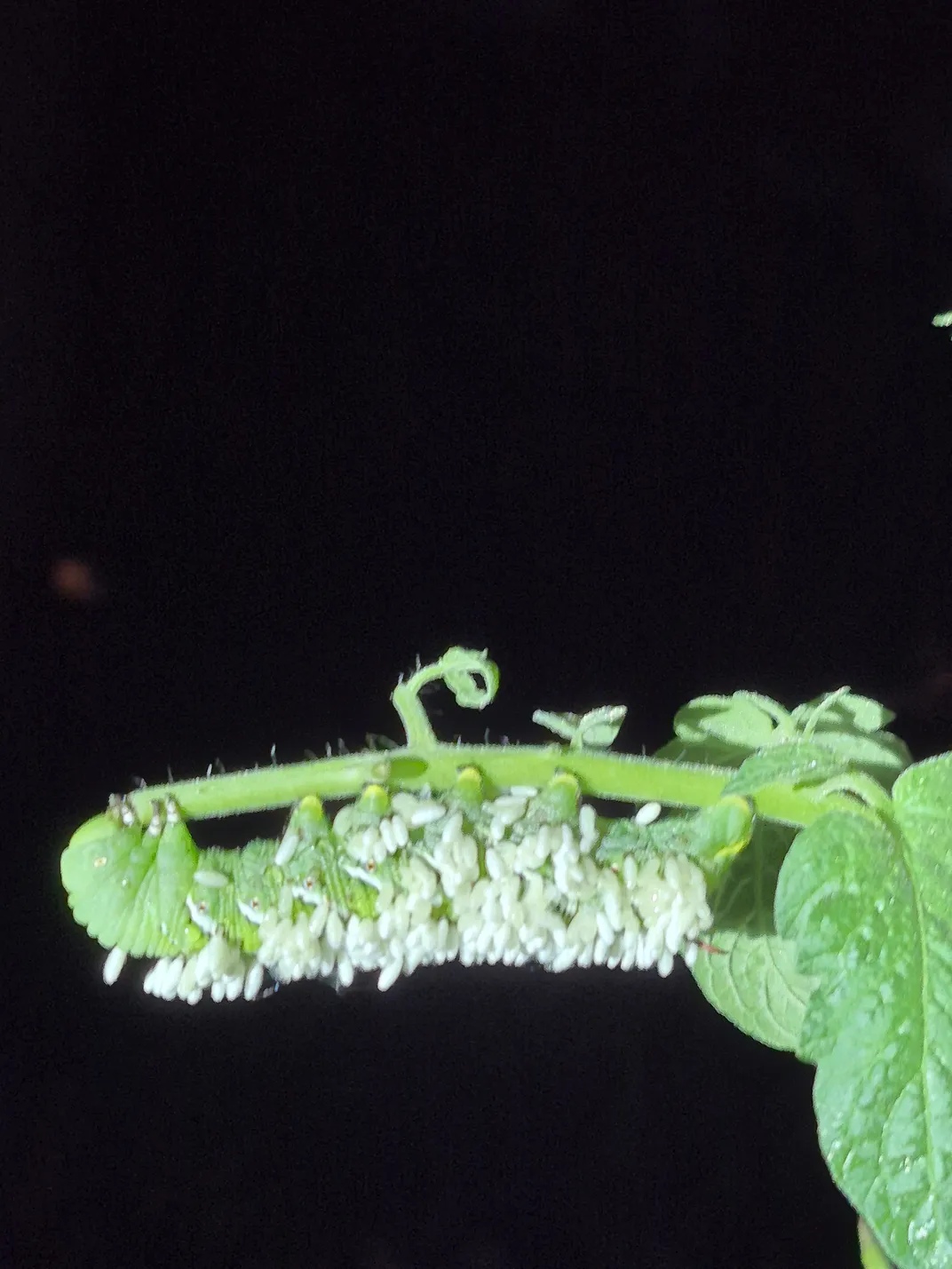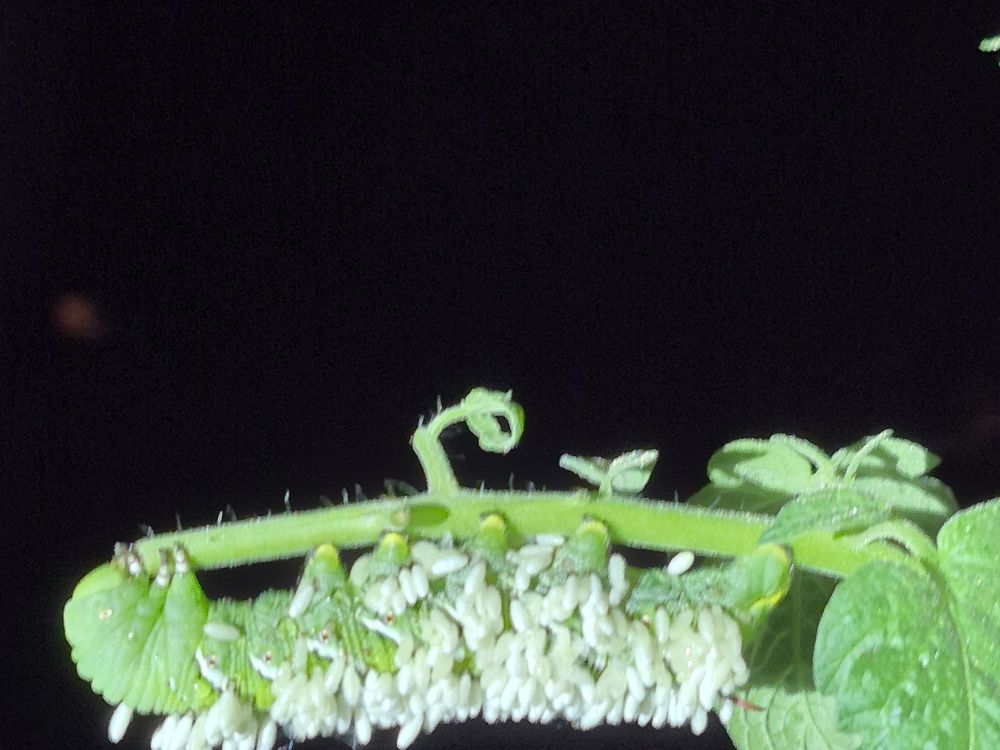 This is an image of a tobacco worm eating our tomatoe plant,whilst carrying a brood of wasp larva.