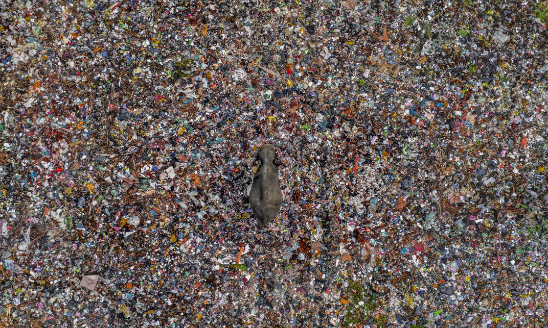 A lone elephant stands amid a sea of plastic waste in Sri Lanka, revealing the stark reality of wildlife forced to forage in human debris. From above, the scale of pollution becomes undeniable—a view that shows the true weight of our footprint