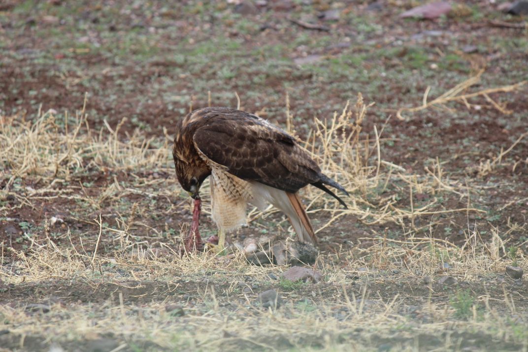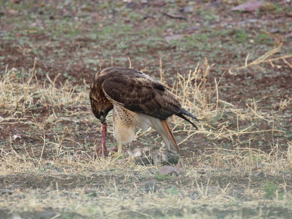 Close-up unedited image of how wildlife survive hawk tearing into a dead rabbit.