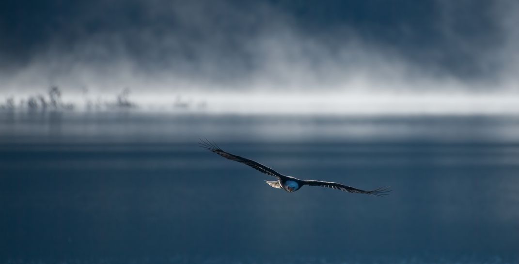 An adult bald eagle is flying directly at me with mist rising behind him, and had some backlighting as well. This gave the image somewhat of a dramatic look to it. I used my Nikon D850, with my Nikkor 200-500 lens.