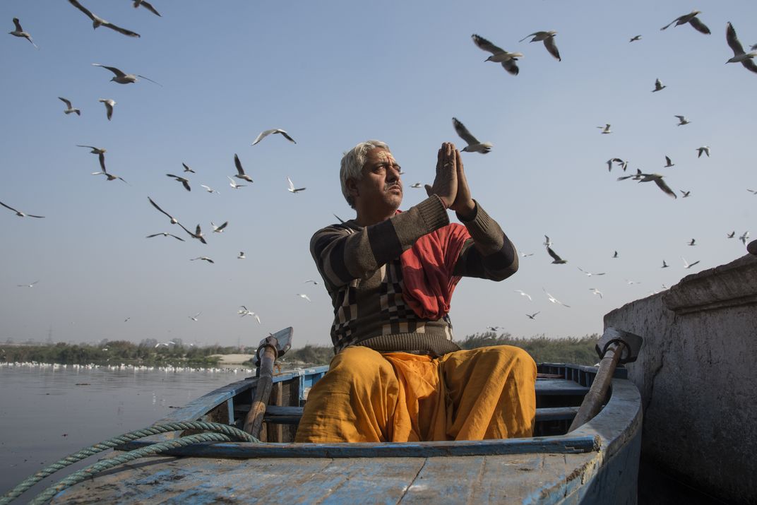 A priest is praying to the Sun God in the morning on the Jamuna River.