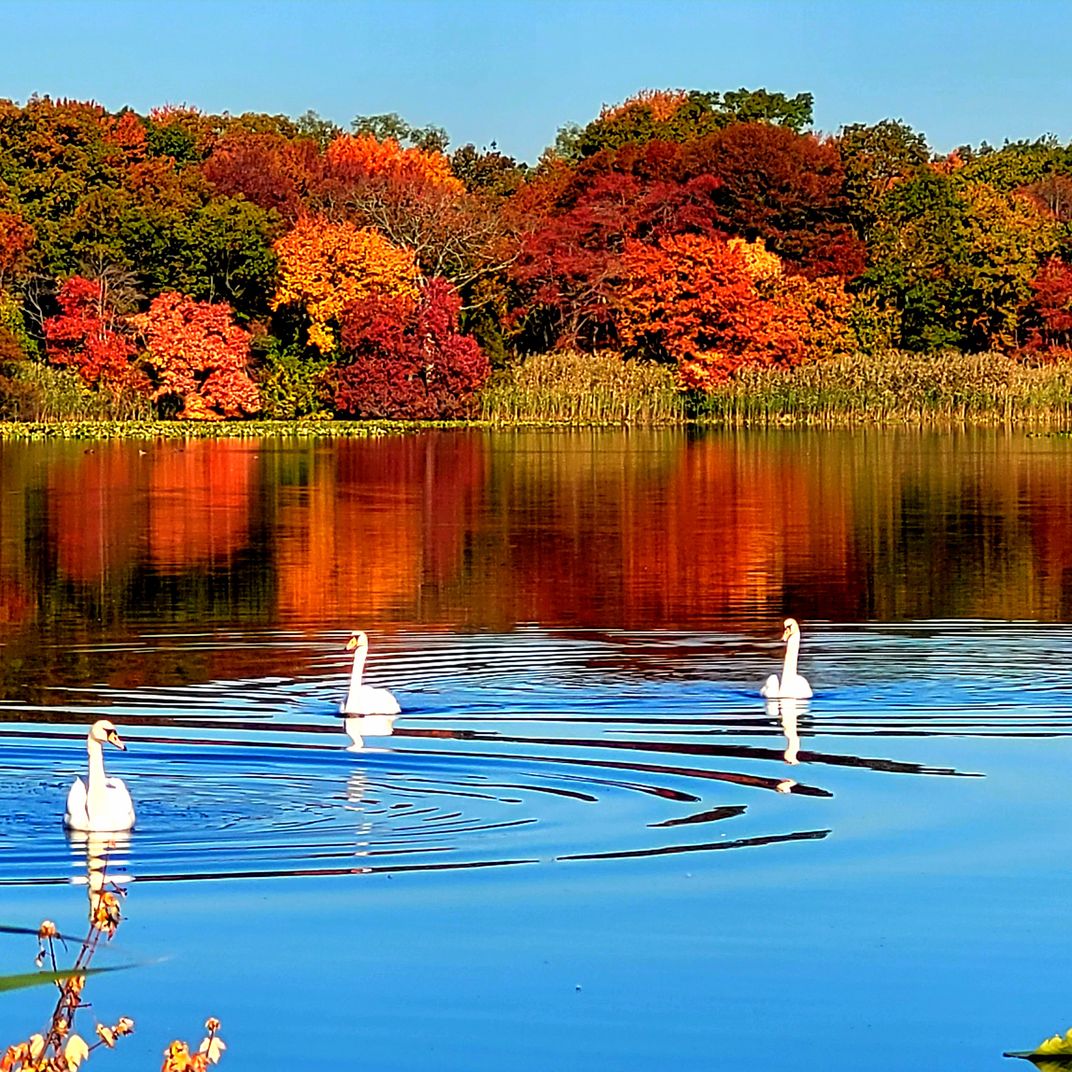 Swans swimming at the Massapequa lake on a nice Autumn day.