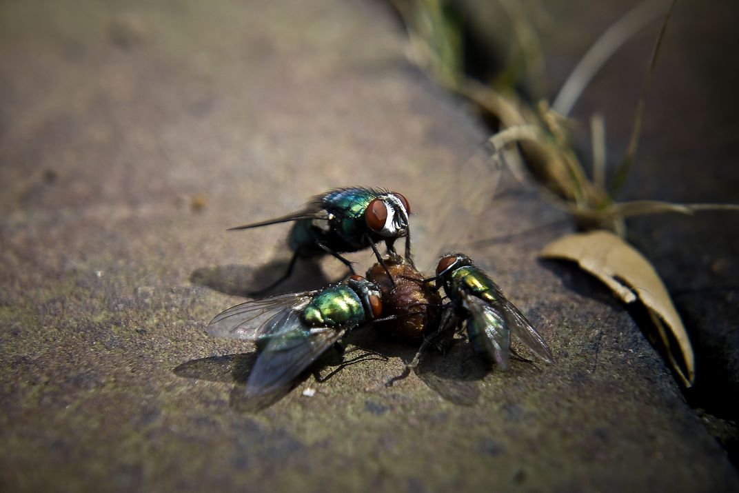 Swarm of flies on a rotting berry.
