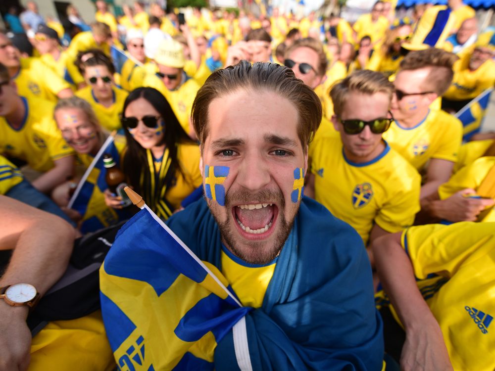 Swedish football fans' parade along the streets of Lublin for the Poland-Sweden football match