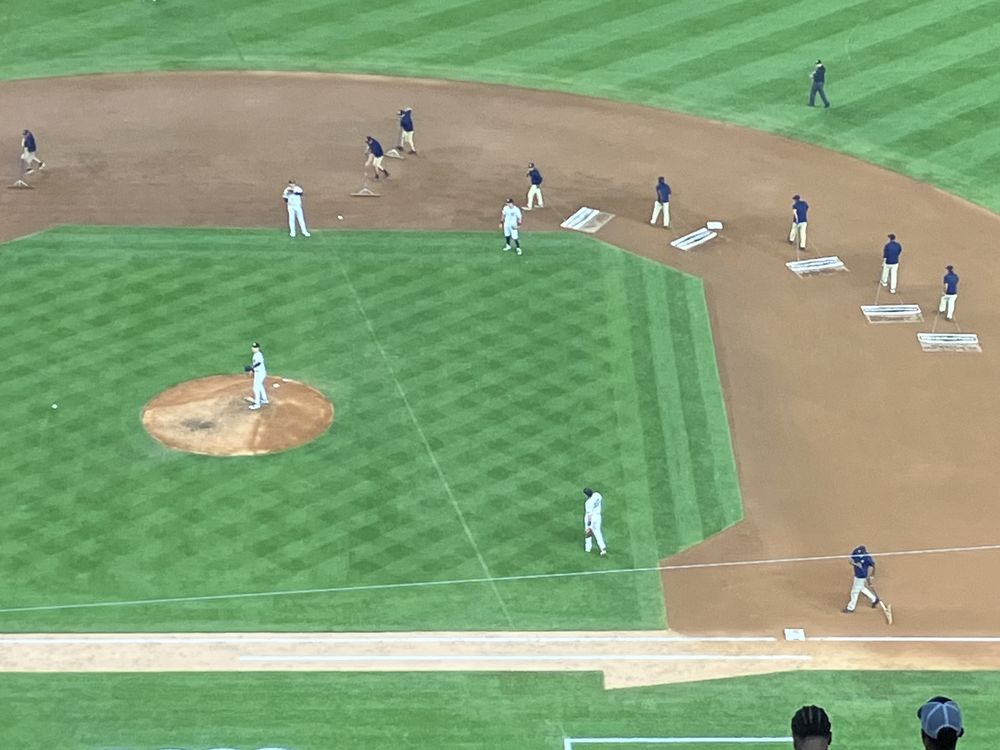 At Yankee Stadium in the Bronx, synchronized sweepers rake the infield dirt during a night game, ensuring the safety of all the players, no matter for which team they play.