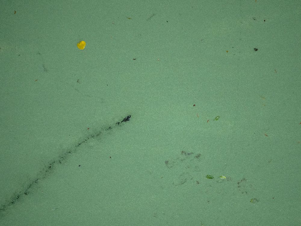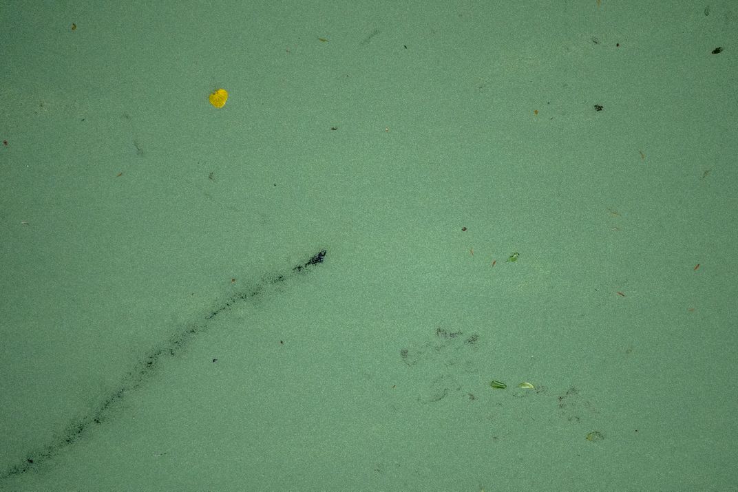 This photo shows a frog swimming in a waterhole. As it moved, it disturbed the green mat covering the water’s surface, creating a diagonal line across the image.