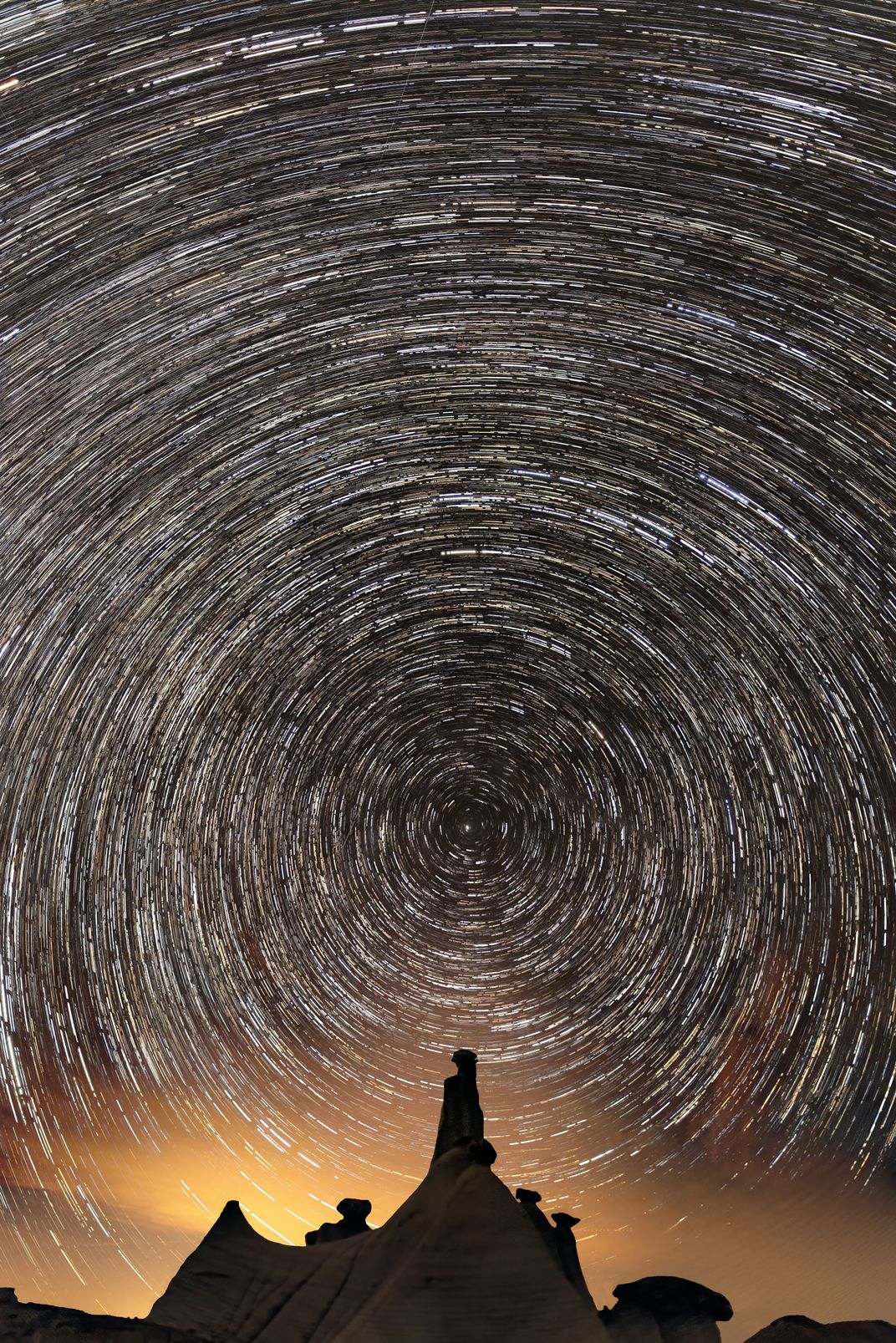 A hoodoo spire points to the only stable point in a sky of swirling stars: Polaris. In reality, the stars are still and it’s the Earth that is rotating. Hundreds of images of the sky were photographed and stacked to reveal this celestial spiral.