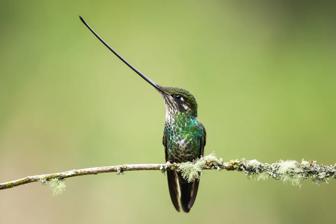 A female sword-billed hummingbird takes a rest outside of Hacienda del Bosque, a small birding eco lodge outside of Manizales, Colombia.
