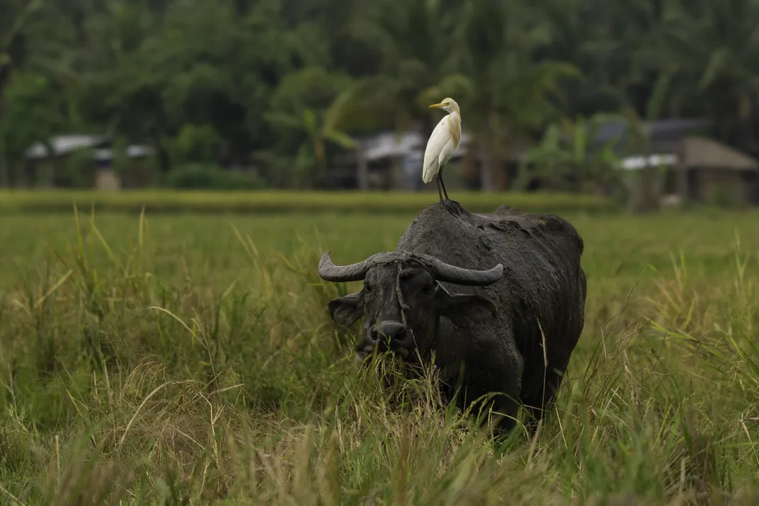 The carabao welcomes the presence of a cattle egret, since the cattle egret feeds on bothersome ectoparasites on its back. The cattle egret gets a meal by being on and around the carabao, who also stirs up insects on the ground as it forages.