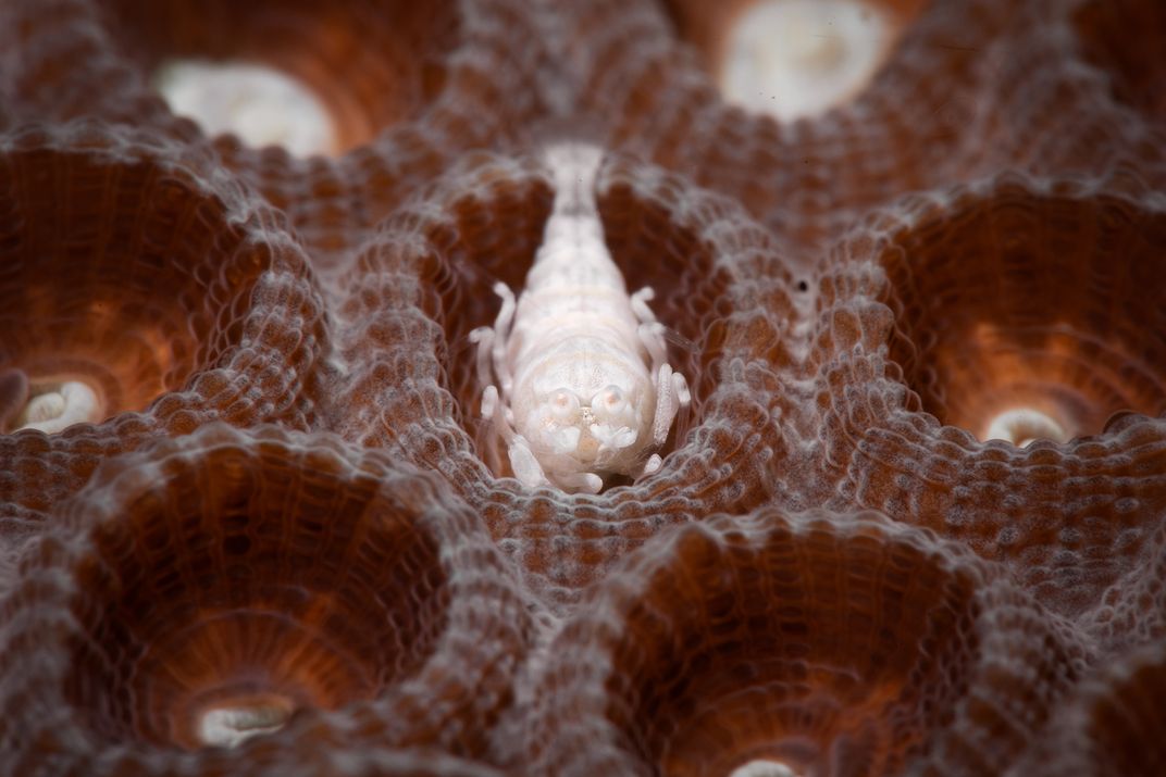 A ghost shrimp sitting in its host hard coral, found on a dive in Romblon, Philippines.