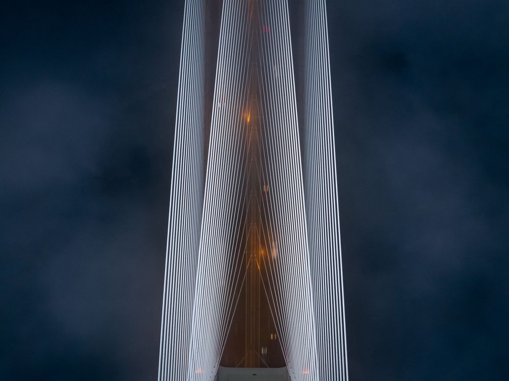 Top-down drone shot of the Rędzin Bridge in Wrocław, captured in dense pre-sunrise fog.
