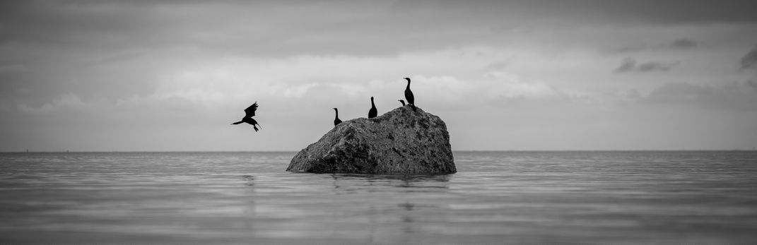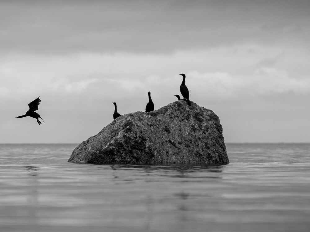 In this breathtaking minimalist scene, a cormorant boldly takes off from a rock while its companions watch.